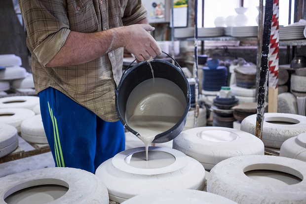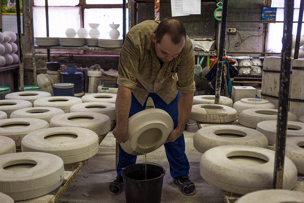Смена Саши и Тани длится 12 часов. Сначала закупленный заранее шликер (массу из глины, кварца и полевого шпата) проверяет технолог, он же дает рекомендации, в какой пропорции лучше разбавить водой эту партию. Масса перемешивается в двухсотлитровой бочке, затем разливается по формам. Глина, из которой сделаны формы, равномерно всасывает влагу со всех сторон будущей тарелки (вот зачем нужны крышки), масса постепенно становится тверже. Через полчаса после заливки невпитавшуюся жидкость сливают, а еще через полчаса с посудин отрезают лишнюю глиняную массу (к этому моменту по текстуре она напоминает пластилин) и ставят клеймо с брендом. В следующий раз формы побеспокоят только через сутки, когда их откроют, вытащат посуду и оставят просушиваться на стеллажах еще на сутки. Следующий этап — оправка. Саша протирает каждую посудину тряпочкой с водой, выравнивая стенки, попутно проверяя, чтобы они были нужной толщины. Законы соответствия: если стенки будут неровными, то и декор ляжет неровно.
