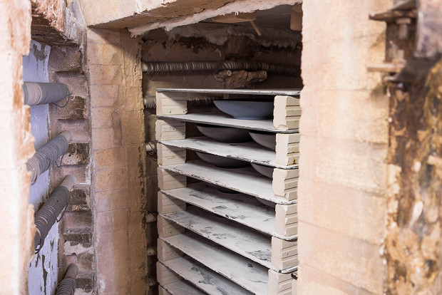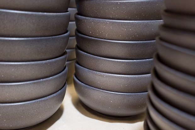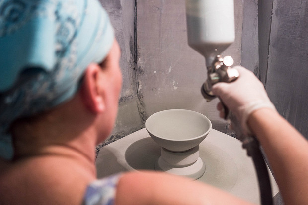 Итак, глазурь. Сначала белой покрывается донышко, затем цветной — стенки тарелок. Все вручную, из пульверизатора. Правильная белая глазурь нашлась случайно, когда, перепробовав массу вариантов и отчаявшись, Лолита просто купила первую попавшуюся в соседнем магазине. Дешевле было бы красить посуду целиком в один цвет, однако и Тимуру, и Лолите показалось, что дно другого цвета — это красиво и говорит о трепетном подходе к качеству. Некоторые тарелки покрываются разными глазурями три, четыре или даже пять раз, именно так получается красивые мраморный или каменный рисунок. Некоторые равномерно покрывают стенки, а некоторые въедаются в них и оставляют темные кратеры. Затем посуду обжигают в печи при температуре 1250–1280 градусов, это меньше, чем нужно для костяного фарфора, однако только при такой температуре глазурь может дать нужных рисунок. В процессе обжига посуда дает усадку, примерно на 12%.