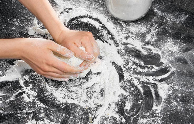 4. Затем тесто вынули из миски и замешивали его 20 минут до крутого состояния, добавляя при необходимости муку.