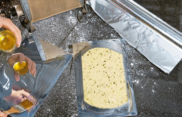 6. Пластины глянцевателя смазали оливковым маслом, выложили на них тесто, смазали тесто маслом и накрыли сверху фольгой.