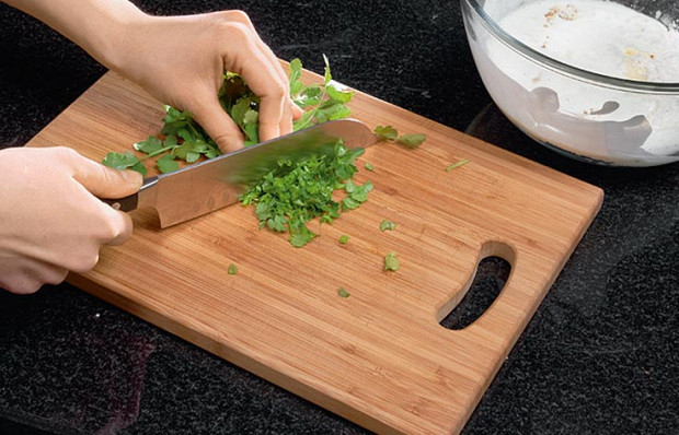 3. Листья кинзы измельчили ножом, добавили в миску к тесту и все тщательно перемешали вилкой.