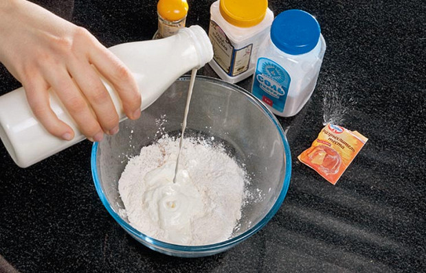 2. В миску всыпали муку, измельченный в ступке кориандр, соль, соду, разрыхлитель — и все залили йогуртом.