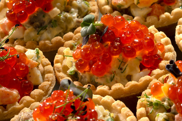 Фуршетный вариант. С тарталеткой в руках удобно ходить и общаться с людьми. Вы не привязаны к столу или тарелке. Мой вариант - это еще и шутка, два главных новогодних блюда в одном. С одной стороны, это оливье, с другой, салат выступает прослойкой между икрой и хлебом, то есть это своего рода бутерброд с икрой. И снова микрозелень, чтобы блюдо выглядело ярче".