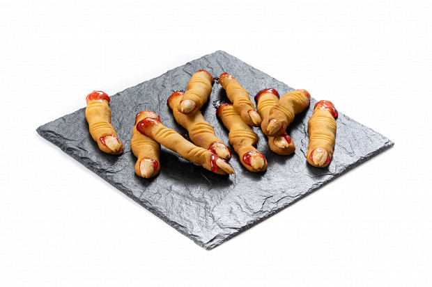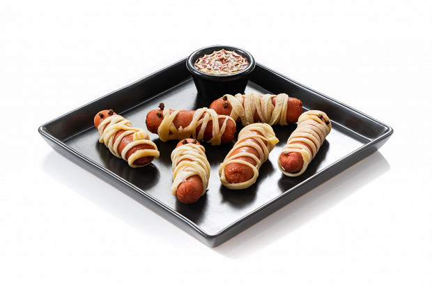 «Их едят, а они глядят». От сосисок в тесте какой же ребенок откажется? Можно особенно не напрягаться и использовать «на пеленки» готовое слоеное тесто. И обязательно запаситесь сырным соусом и кетчупом: без них «мумиям» будет одиноко. А для пущего визуального эффекта нарисуйте на соусе паутинку при помощи обычной зубочистки.