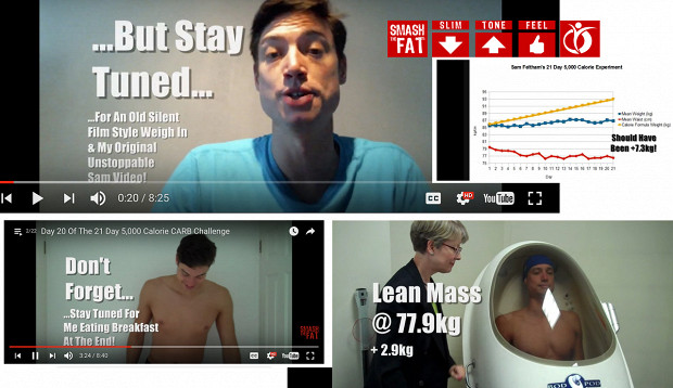 «5000 калорий в день» — это эксперимент блогера Сэма Фелтхема , который пытался опровергнуть идею о том, что все калории равны. Сначала Сэм в течение 21 дня употреблял безуглеводный рацион с калорийностью, превышавшей 5000 ккал, причем основу пищи составляли жиры. А затем 21 день он питался настолько же калорийной пищей, но уже в основном углеводной. Теоретически в первом случае из-за переизбытка калорий Сэм должен был набрать по меньшей мере 7,5 кг. Но весил он после трех недель обжорства всего на 1,3 кг больше, чем в начале эксперимента. Второй эксперимент прошел не так удачно — плюс 7,1 кг и целых 9,25 см в талии. Итог — так как количество калорий было одним и тем же, можно считать, что дело не в количестве калорий, а в их источнике.