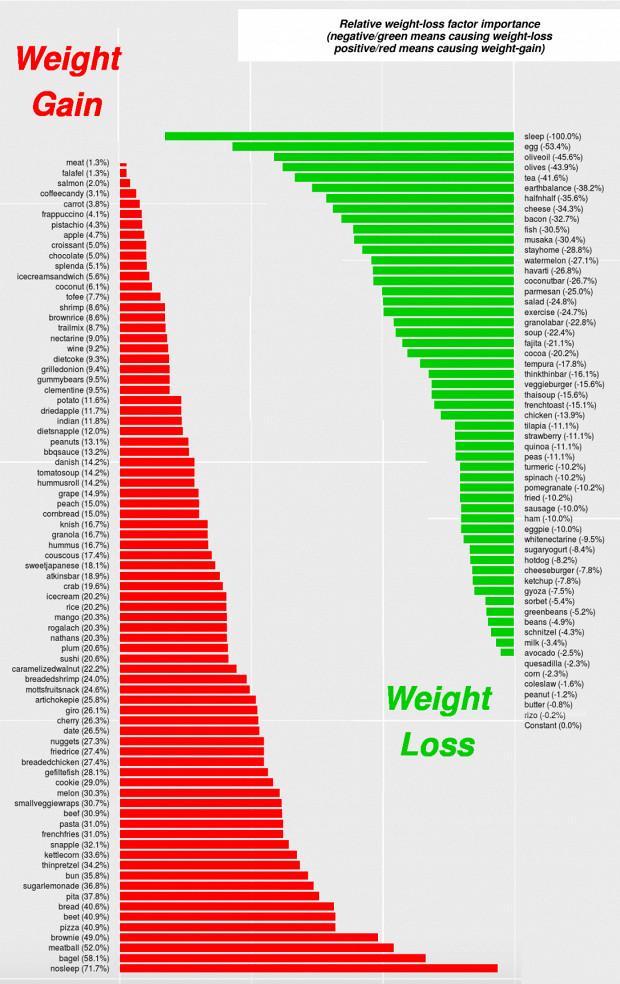 Гиковская тема с машинным обучением, нейросетями и статистикой: программист-аналитик Ариэль Фейгон скрупулезно записывал абсолютно все факторы, которые приводили его к похудению и к набору веса (в одном ряду были как продукты, так и такие детали, как недосып), затем прогнал их через компьютерный статистический анализ и подтвердил, что низкоуглеводная высокожировая диета способствует сбросу веса.
