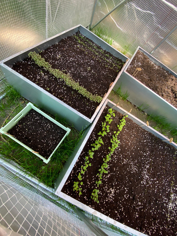 Уже конец мая, а мы посадили только редис, морковь, салат мизуна, мангольд, кинзу (в теплицу), горох и пак-чой у нас растут в редакции под специальной фитолампой, и мы снимаем это на камеру — просто для красоты. Скоро посадим огурцы в отдельный мини-парничок.