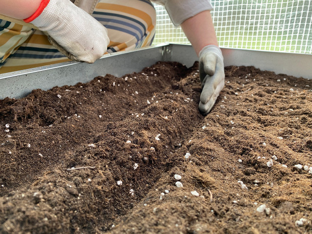Оказалось, что у нас в саду нет земли. Не знаю, как растут наши липы, но стоило нам копнуть, оказалось, что земли от силы сантиметров 7, а под ней какой-то строительный мусор и асфальт. Поэтому наш бюджет мгновенно вырос — пришлось покупать землю и делать насыпные грядки. Мы пересмотрели много разных роликов в интернете и поняли, что на таких грядках люди даже картошку сажают! Чем мы хуже?