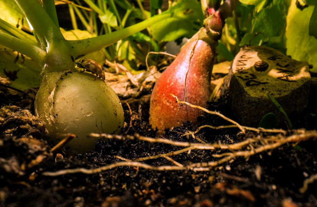 Еще одно пополнение — арбузная редиска. Если вы читали наши дневники, то с редиской у нас раньше не ладилось: то она уходила в ботву, то ложилась на поле. Теперь, послушав советы доцента Тимирязевки Марины Евгеньевны, мы посадили редиску свободно: вместо планируемых кустов двадцати только четыре. Вроде все идет хорошо, и редиска уже взошла. Верим, что попытка номер пять будет успешной.