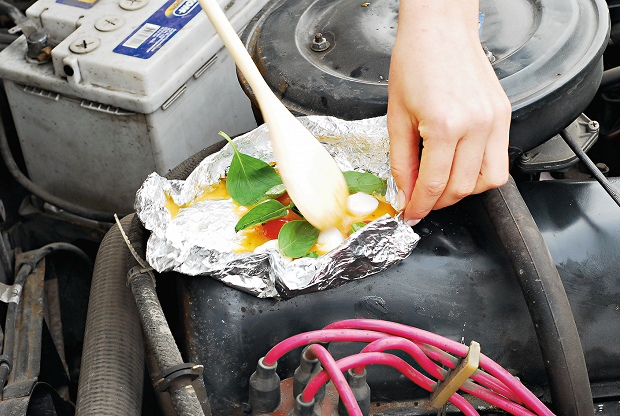 5. Завернули края фольги над омлетом, поместили сверток в конверт из фольги, положили обратно на радиатор и закрыли капот.