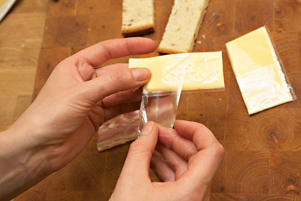 2. Хлеб, сыр и мясо нарезать по форме рабочей поверхности щипцов (с сыра удобнее снять упаковку уже после нарезания).