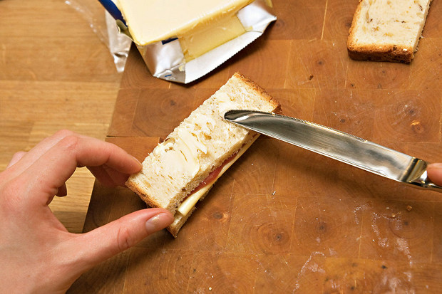4. Собрать бутерброд: хлеб с обеих сторон необходимо смазать маслом — без него не получится аппетитной корочки.