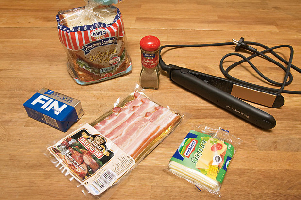 1. Для приготовления этого сэндвича вам потребуются хлеб, плавленый сыр, грудинка, перец и утюг для волос.