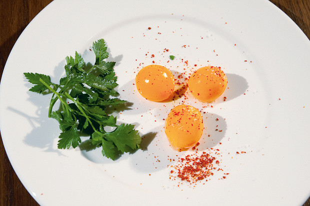 (Кстати, отдаленно похожий фокус проделывает московский шеф-повар Владимир Мухин в своей гастрономической лаборатории. Он просаливает желтки и держит их в холодильнике два-три месяца, после чего они приобретают текстуру вяленой икры.)