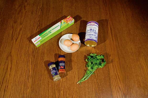 1. Для приготовления яичницы нам потребовались яйца, пищевая пленка, соль, специи, петрушка и морозильник.