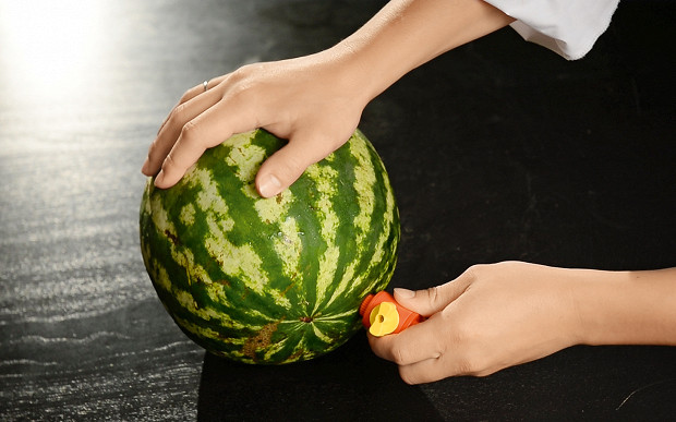 2. Первым делом мы круглым ножом вырезали небольшое отверстие в арбузе — до мякоти — и вставили кран.