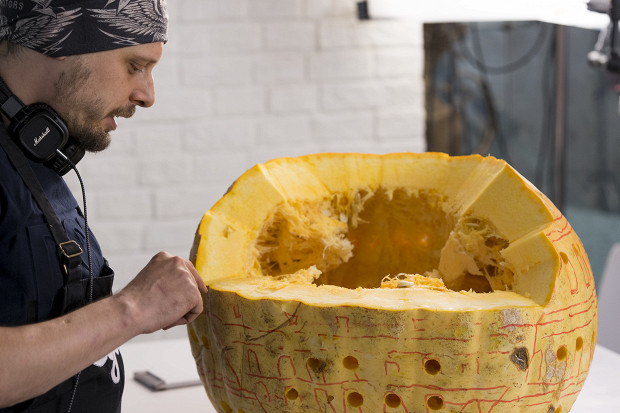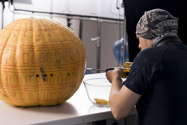 За дело взялся наш дизайнер, иллюстратор и мастер на все руки Денис Ляшкевич. Выступив в роли феи-крестной, за 7 часов Денис превратил тыкву в произведение искусства. Роль волшебной палочки сыграли шуруповерт с пером, скальпели, лазерный нивелир и резак по дереву. Как это было — смотрите в нашем видео.