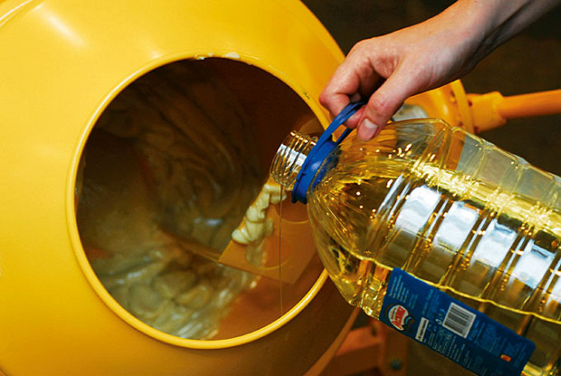 5. Потихоньку подливали в бетономешалку масло и, чтобы майонез не был слишком плотным, добавляли немного воды.