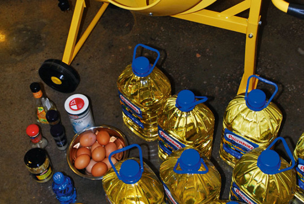 1. Для производства майонеза нам потребовались бетономешалка, 10 литров рафинированного масла, 10 яиц, соль, лимон и специи.