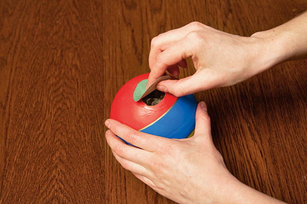 2. Ножницами в мяче вырезали круглое отверстие диаметром около двух сантиметров.