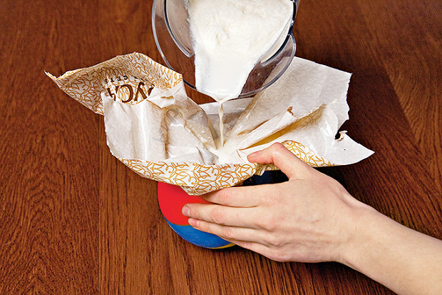 5. Cначала мы вставили внутрь мяча пакет, затем заполнили его взбитыми сливками и плотно перевязали веревкой.