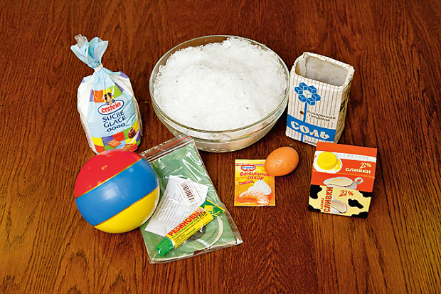 1. Для мороженого нам понадобились жирные сливки, ванилин, яйцо, сахарная пудра, много льда, соль и полый резиновый мяч.