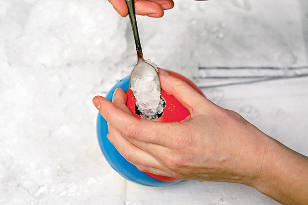 4. Колотым льдом заполнили мяч наполовину, добавили три столовые ложки соли и перемешали.