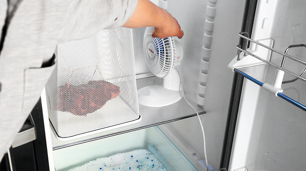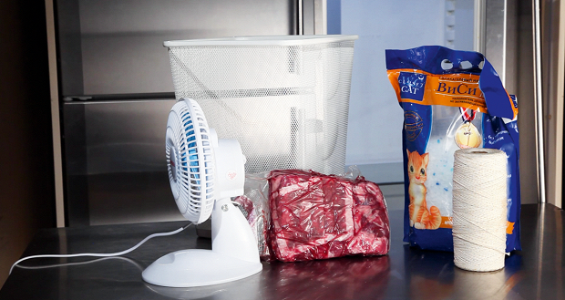1. Нам понадобились холодильник, отруб рибая, кулинарная нить, силикагель, офисная урна и вентилятор.