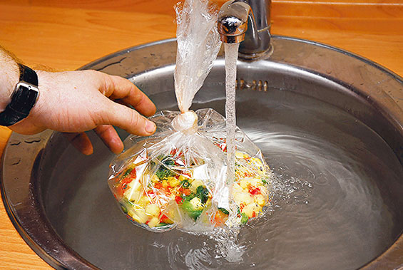 4. Надо заткнуть отверстие в раковине и включить кипяток. Воздуха в пакете должно быть немного, чтобы пакет тонул в воде.