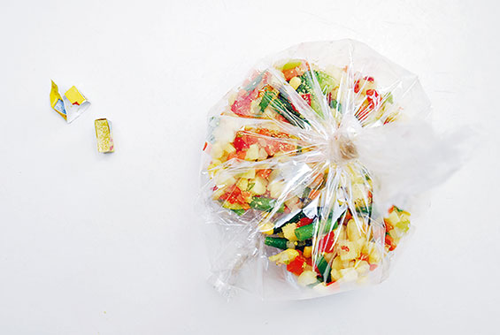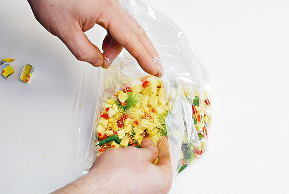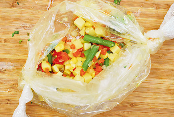 2. Из рукава надо сделать пакет, в который последовательно насыпаются овощи и раскрошенный бульонный кубик.