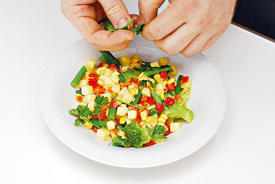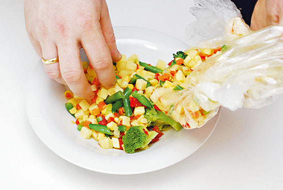 6. Содержимое пакета надо пересыпать в тарелку. Одного стандартного пакета овощей хватает на две порции.