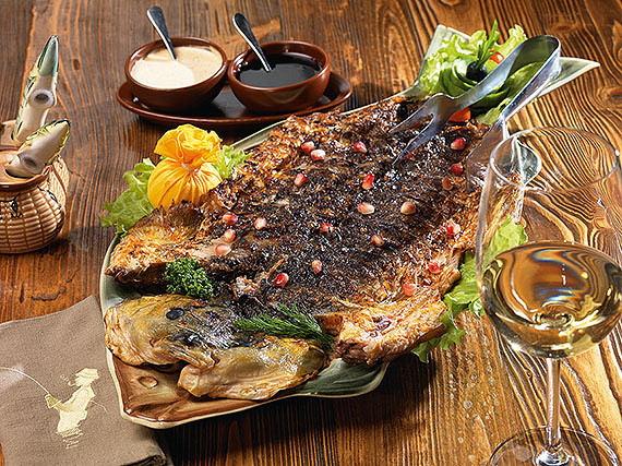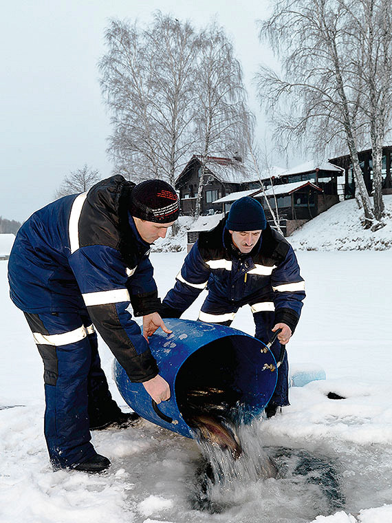 Пруд, который мы посетили, наполнен рыбами всех мастей: тут водится щука, окунь, карась, сазан, форель, сом. Главная достопримечательность пруда — белуга в 120 килограмм. Ее истерзанная крючками физиономия красуется на фотографиях охотников-рыболовов. Белуга привычно и несколько устало позирует фотографу. Поймать и забрать домой ее не разрешают. Рыболовам положены все остальные рыбы. В день в пруду вылавливают порядка ста килограмм трофеев. Самый ходовой товар на пруду — форель.
