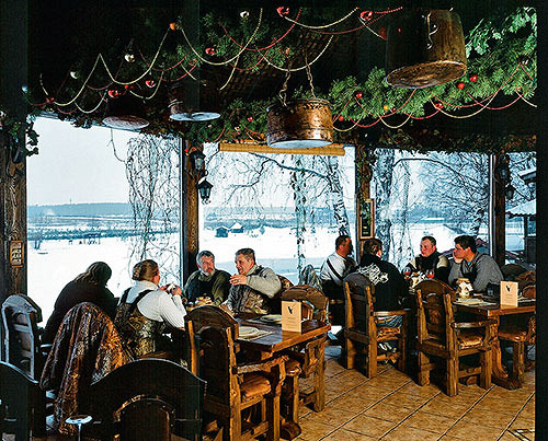 В обеденном зале с панорамным видом на пруд все расселись чинно. Ждут. Говорят мало. Сначала принесли соленья и сало. На второе — уха. Пунктиром проходит хреновуха местного производства. После горячительного разговорились. Диалоги о рыбалке: кто где ловил, что поймал. Гаишники заказали еще хреновухи. Темнело. Охотники засобирались, дотемна еще порыбачить охота. Я же пошел на кухню расследовать секрет ухи и копченой рыбы.