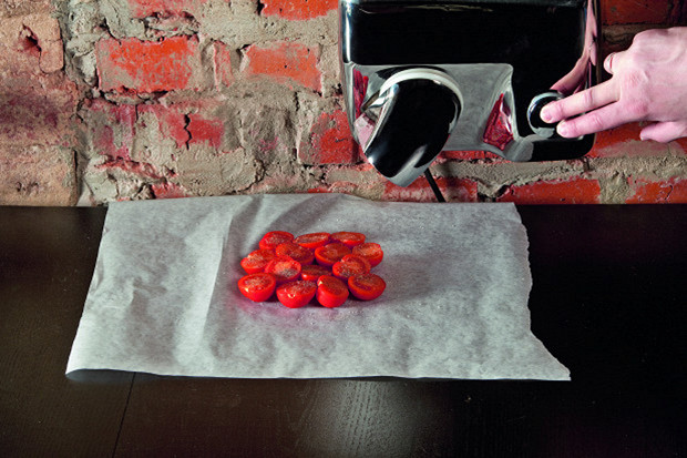 Хороший опыт, но непростой. Чтобы создать иллюзию итальянского климата с его сухим ветром, мы в течение четырех часов включали фен для рук. Зато результат получился замечательным: помидоры были отправлены в банку с оливковым маслом и вскоре съедены.