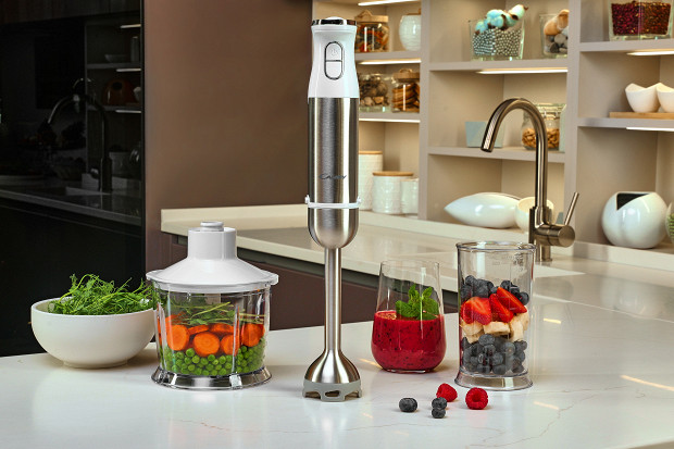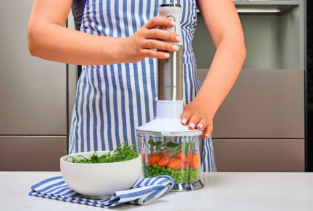 Кроме мощности важна функциональность: один блендер — и сразу три насадки. Измельчителю можно доверить приготовить фарш для мясного рулета и натереть морковь для рыбы под маринадом, довести до гладкости паштет и нарубить орехи и зелень для салатов. Если резать укроп или петрушку обычным ножом, они потеряют много сока, а быстрое измельчение при помощи лопастей ножа из нержавеющей стали сохраняет весь сок и аромат, зелень и пахнуть будет по-другому, насыщеннее — вы это сразу почувствуете.