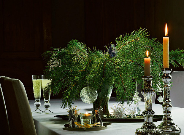 Миниатюра новогодней елки — букет из пушистых сосновых веток. Надо только поставить их в вазу, на место подарков разложить елочные игрушки. Яркости и чрезмерного украшательства не надо — все предметы лучше выбирать однотонные и даже прозрачные. А объем создаст зеркало или серебряное блюдо, если положить его под всю эту инсталляцию. Пить, конечно, шампанское.