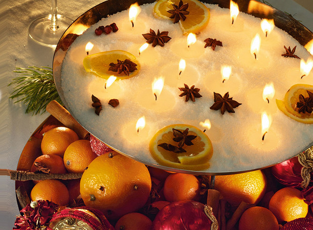Пробки на новогоднем столе можно избежать с помощью двухъярусного блюда. К примеру, это предназначено для устриц, но по случаю Нового года его верхний этаж превратился в большую огненную чашу: тут насыпные свечи, цветочки бадьяна и апельсиновые дольки. Внизу — неизменные мандарины вперемежку с елочными шарами и всякими пряностями вроде корицы и гвоздики. Все, за исключением игрушек, можно кидать в глинтвейн.
