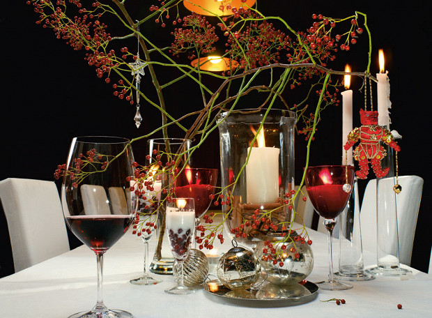 Сочетание красного и зеленого — классическая рождественская рифма. Но и в этом пошловатом альянсе есть место эстетству: пусть зелеными будут тонкие ветки дикого боярышника, а красными — его плоды. Усиливаем пурпур свежей клюквой в насыпных свечах, заменивших шампанское в высоких бокалах. Корица для глинтвейна отправляется в глубокие подсвечники. Реформировать не надо только напиток — пусть остается хорошее красное вино.