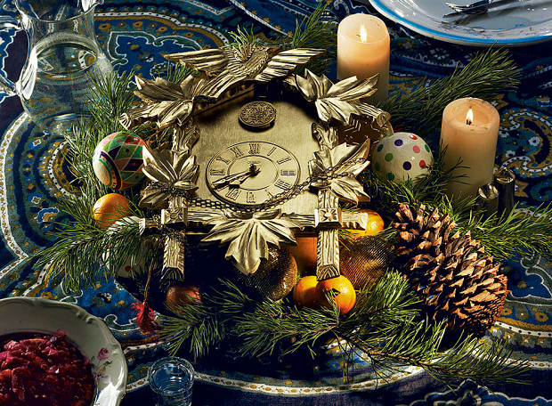 Наблюдать за течением времени и сменой даты можно и не включая телевизора. Заливаете краской из баллона самые неприглядные часы из обычной пластмассы — и вот вам личная точка отсчета и доминанта для стола. Кремлевские елочки изображает выложенный гнездом лапник, праздничный дух — свежие мандарины. Пить придется водку.