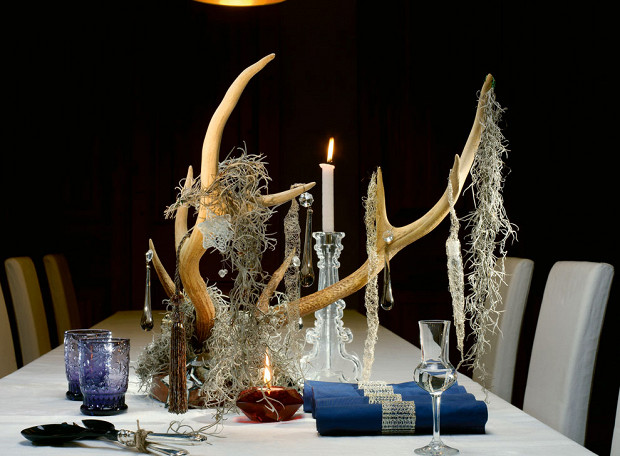 Оленьи рога могут стать центральной фигурой для неоготического стола. Рога можно украсить мхом или лишайником тилландсия и прозрачными сосульками и золотистыми подвесками. В неровном свете свечей все это будет таинственно мерцать и переливаться. Рекомендуем выпивать граппу и читать с детьми сказки братьев Гримм.