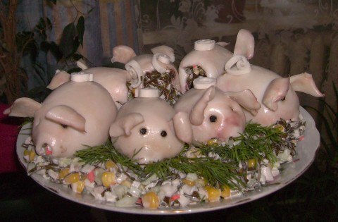 Скорее всего, это салат из крабовых палочек, украшенный кальмаровыми поросятами, — но вдруг нет? Отличная замена праздничному молочному поросенку: во-первых, ощутимо дешевле; во-вторых, вместо одного поросенка — целых семь!