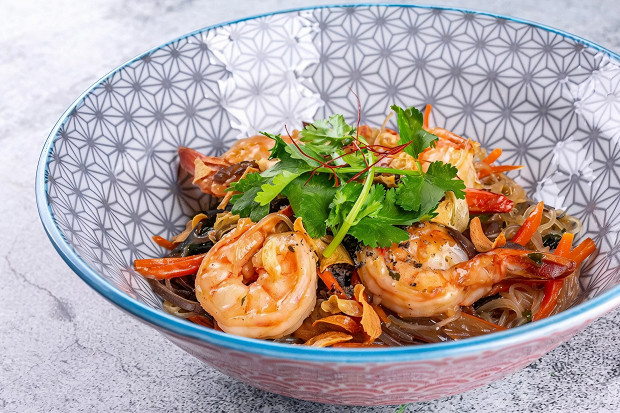 В Китае лапша — символ долголетия и дороги длиною в вечность, а креветки символизируют смех — в китайском языке эти слова созвучны. Поэтому их присутствие на новогоднем столе является обязательным. Тут лапша сочетается с крупными тигровыми креветками и водорослями вакамэ — свежий вкус, прекрасный именно в своем минимализме, в соседстве пресного, острого и белкового. Рецепт придумал шеф-повар Евгений Мещеряков для ресторана Oishii.
