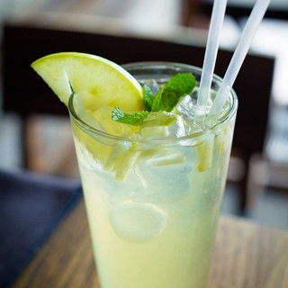 2Добавить в стакан джин, сок лимона, сок яблока, сахарный сироп, 5 листиков мяты, пару плоских тонких долек яблока.
