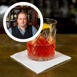 6Высыпать из отставленного бокала ароматизированный лед. Перелить в тот бокал коктейль, загородив дорогу кубикам льда барным ситечком — чтобы они не попали в готовый сазерак.