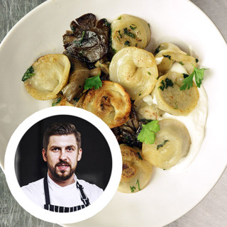 8Добавить к ним соус из опят, довести до кипения и снять с огня. Затем выложить кундюмы вместе с соусом в тарелку, рядом выдавить мусс из пармезана и добавить немного укропа.