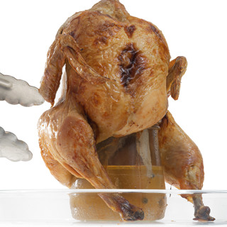 В случае с курицей банка — не прихоть, а функциональный элемент. Во-первых, курица так прогревается со всех сторон. Во-вторых, пар компенсирует выходящий из курицы сок, и мясо остается нежным, а за счет пряностей курица приобретает более тонкий аромат. Банку лучше брать высокую, но узкую: так удобнее сажать на нее курицу.Энергетическая ценность на порцию