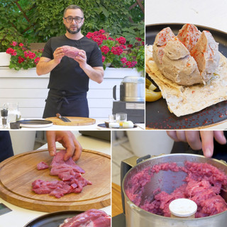 3В третий раз взбить мясо, долив то же количество воды. Фарш к этому моменту должен иметь очень нежную, вязкую текстуру, похожую на суфле. Чтобы добиться от фарша идеальной текстуры, его можно пропустить через мелкое сито. Убрать фарш в холодильник минимум часа на 3, а лучше на ночь, чтобы он отдохнул.