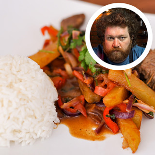 6В сковородке вок, предварительно почистив ее и снова спрыснув растительным маслом, обжарить до коричневой корочки куски говядины, после чего бросить туда сладкий и острый перец и жарить, помешивая или встряхивая, примерно две минуты. Добавить лук и жарить еще минуту. Добавить помидоры и маринад из-под говядины — и жарить еще две-три минуты, не забывая встряхивать и перемешивать. В конце вмешать жареную картошку и рубленую кинзу. Снять с огня, разложить по тарелкам и тут же подавать.
