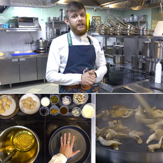 5Разогрейте сковородку, добавьте растительное масло и обжарьте вешенки и очищенный и нарезанный шалот.