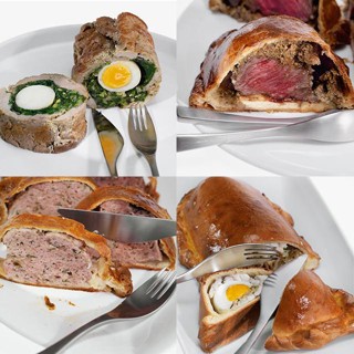 7Сделать в центре куска свинины крестообразный надрез и с помощью ножа раскрыть мясо, как конверт, чтобы получился большой плоский лист. Слегка отбить дном сковородки. Положить на большой тройной лист фольги, сверху разместить шпинатную начинку, а в середину выложить в ряд 3 очищенных яйца.